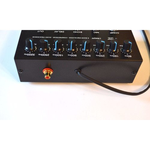 8-band EQ with a compressor, adjustable microphone amplifier and Echo effect is housed in a good looking matte black metal casing, slanted front panel with silk screened scales that doesn’t rub off. At the bottom of the housing rubber feet.